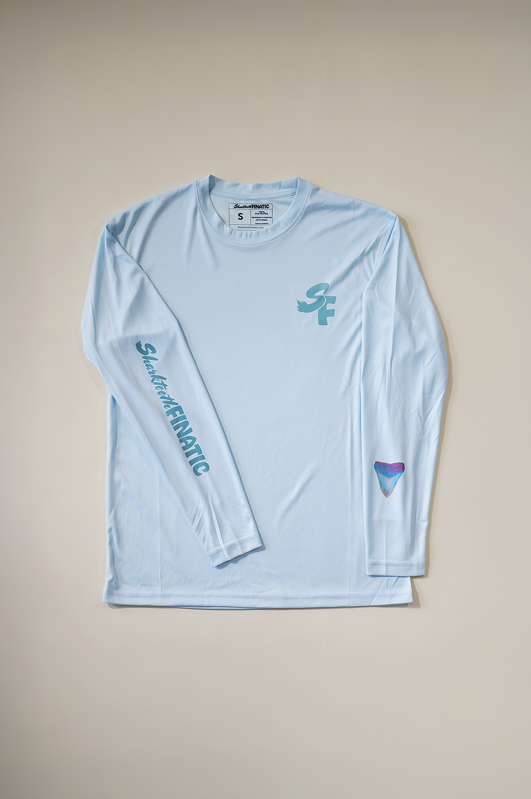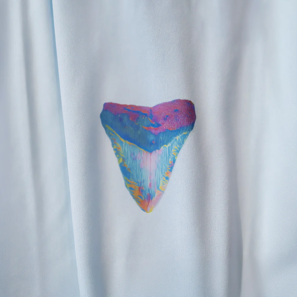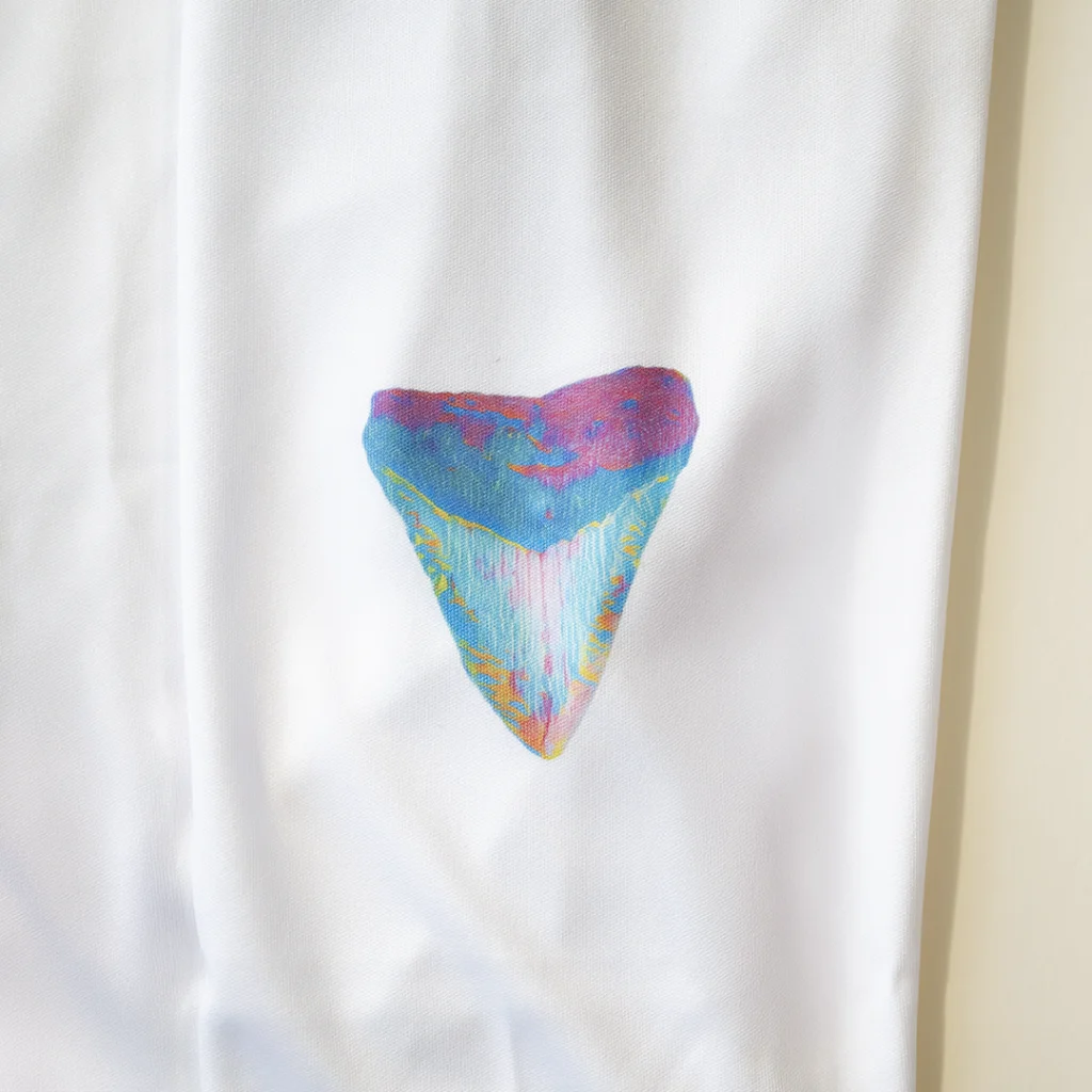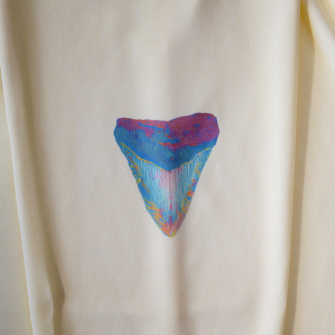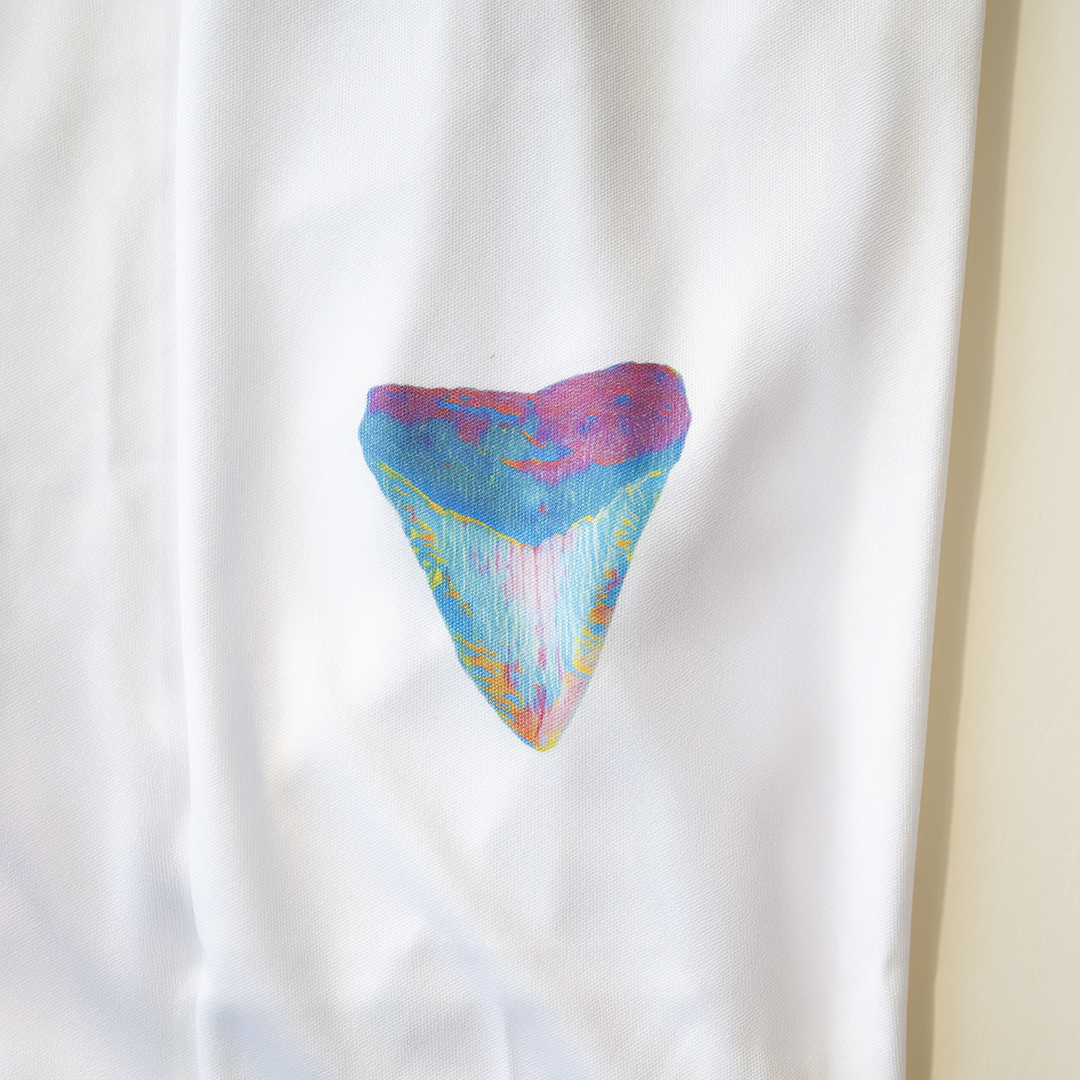 All artwork is created by us using shark teeth from our personal collection as base designs, and then artistically enhanced as digital artwork. Artwork on our performance shirts are applied using dye sublimation, pressed by us in our workshop in Bradenton, FL.